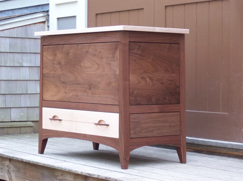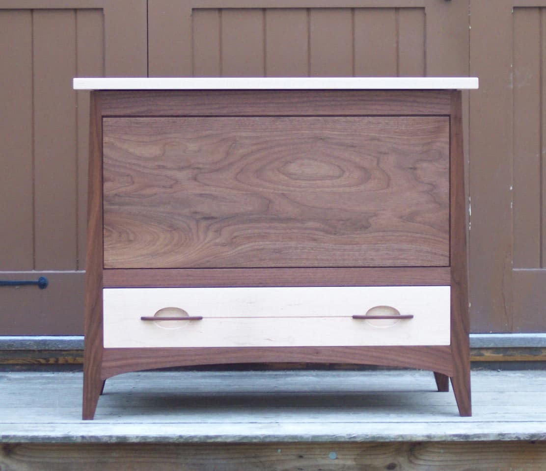 This was a custom piece commissioned by a client who wanted elements of my Tapered Cattail cabinets in a chest and also wanted to use some beautiful tiger maple as a contrasting wood to the gorgeous black walnut I obtained for her. The rail to leg connection uses the same joinery as my other “Tapered” cabinet pieces and the chest also has the same outside taper of the legs and outside walls. The solid hand-dovetailed drawer incorporated a thin horizontal groove connecting the two hand sculpted pulls echoing the door/pull detail of my Tapered Cattail cabinet door as well as the pulls of my Boothbay desk. This is just one example of the wide-ranging custom options that are possible when a client wants elements and features of my existing designs combined with new personalized functional requirements.