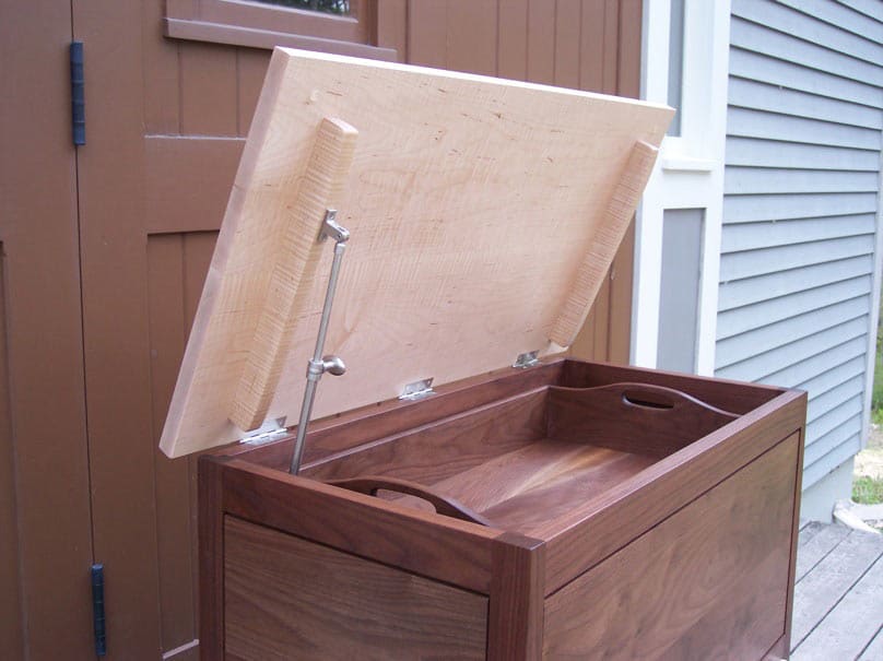 Tapered Chest, walnut and tiger maple. 34″h x 18″w x 40″. $6,000.
